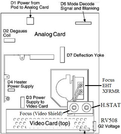 1. Select option 1, pattern A (Crosshatch), 2. Adjust focus control on video shield to focus vertical lines. 3. Adjust focus control on EHT transformer to focus the horizontal lines. 4. Press PF3 to return to setup patterns. Option 5, pattern E (Focus Pattern), check focus settings. 5. Press PF3 to return to setup patterns. Option 1, pattern A (Crosshatch), and press spacebar to get a white crosshatch pattern. 6.