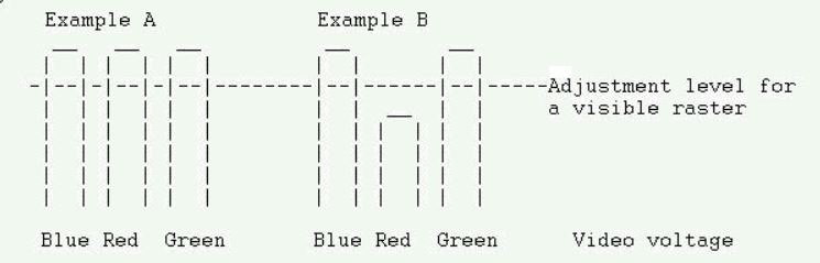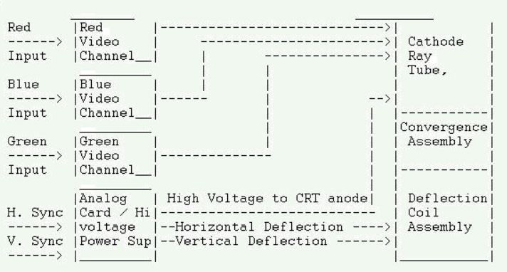 NOTE: This is a common-sense progression of diagnosing your 9517. The 8517 might use a different rear cover., but is similar in construction. We start with a Self-Test, because the issue may be cabling, software drivers, or a problem inside the system unit. Then we remove the rear cover, remove the EMI shield, and then on to the Function Tests. 1.2.2 Self-Test The self-test checks for a full white display screen. The white screen will have black borders of various thickness on one or all sides depending on which display you are servicing. 1. Power off display. 2. Disconnect signal cable. 3. Power on display. Note: Power on display for five minutes before starting test. 4. Set contrast and brightness controls to max. 5. Self-test pattern on screen should be a full white raster ( pattern of horizontal scanned lines) with a black border. 6. If self-test pattern is not correct, go to 9517 / 8517 Monitor Function Checks 7. If the self-test raster appears correctly, the problem may be caused by the system, the display signal cable, or connection. Connect display to another system unit to test video problem, then proceed to function and pattern checks and adjustments for specific display you are servicing. Figure 2-1. Typical Self-Test Pattern ![]() Note: There are two fine transverse black lines across the screens of 8517/9517 Displays. These are part of the normal background for these displays. Ed. They use Sony Trinitron CRTs. H12816 Service Aid for PS/2 and ValuPoint Monitors Service Information: 1. The basic functional units of the monitor. 2. Importance of Self Test. 3. Using the monitor to diagnose itself. 4. Sequence of adjustments 5. Correct tool. 6. Definition of "color point". 7. Degaussing 8. "New Defective" analog cards/card tray assemblies 9. Burned spot on the screen. The basic functional units of a display are: a. The power supplies. The low voltage P.S. must be working to provide input to the High voltage P.S. which provides anode or screen voltage to the display. If anything is "visible" on the screen, both power supplies are functional. b. The video amplifier board. The analog video signals from the system unit monitor adapter are amplified and controlled on this board. The red, green and blue signal channels are separate, but nearly identical circuits. All three must be adjusted properly to provide the correct color balance. (example: RED, BLUE, and GREEN, at the proper intensity or "gain" = WHITE). c. The deflection circuits (analog board). This board controls the deflection (movement) of the electron beams controlled by the three video channels (red, green, blue) and the final geometry (shape) of the raster on the screen. d. The ITC (Integrated Tube Component, or CRT assembly). This assembly is adjusted at the factory for color convergence. These adjustments are sealed. There is no requirement to adjust them in the field and this should NOT BE ATTEMPTED! The deflection coil on the ITC is an "electro-magnet" that controls the electron beam deflection. The following block diagram is representative of most PS/2 and Valuepoint monitors: ![]() * ITC * Integrated Tube Component Assembly Page 2-4, "SELF TEST": This test is SIGNIFICANT in that it provides a great deal of information concerning not only the operational condition of the display, but also the "state" of its color purity (color point) adjustments. Note: The most difficult and complex operation a color monitor must perform is to produce a full "white" screen (raster). The appearance of the Self-Test raster provides a direct indication of the following monitor functions: a. Both power supplies are functioning. (If either fails, the screen would be totally blank.) b. The horizontal and vertical deflection circuits (analog board) are working. During self-test Monitor signal cable dis-connected), the horizontal and vertical deflection circuits (oscillators) are "free running". This is why the edges of the self-test raster are poorly defined. The monitor adapter in the system unit provides precise vertical and horizontal Sync signals that "synchronize" the deflection circuits and produce the sharply defined edges of the raster during normal operation. c. The general condition of the video board and the ITC (Cathode Ray Tube assembly). To produce the self test "white" screen, the display must be"in sync" (no horizontal or vertical rolling, etc.) and all three video channels (red, green blue) must be in proper signal balance (Video Level and Cutoff Voltage, Page 8-20). If the self test raster does not appear "white", it is most likely due to a mal-adjustment of one or more of the video level or cutoff voltages. Refer to page 8-20 of the Display Hardware Maintenance Manual and perform these adjustments prior to doing the Geometry adjustments. ![]() Note: In example A, a white self test raster is visible because RED, BLUE and GREEN video gains are in close balance, therefore the human eye actually perceives "White". Without this balance, a color other than white will be seen. In example B, a non-white raster is visible because the Red video gain is too low for proper "white balance." In extreme cases of mal-adjustment, the Self-Test raster may not be visible. Adjusting one of the video gains "up" may provide a visible raster, which by following the adjustment procedure on page 8-20, can be adjusted to meet all functional criteria without FRU parts replacement. Using the monitor to diagnose itself: Diagnosis Example: A "White line" failure. The symptom is a horizontal white scan line across the center of the monitor. It is usually caused by a component failing in the vertical oscillator or deflection circuits of the monitor. Using the block diagram above, we can often determine the missing functions and the most likely failing unit. 1. Both power supplies are working. (Any image on the screen indicates BOTH power supplies are functional.) 2. The line is "white," therefore all three video channels (red, blue, and green,) appear t