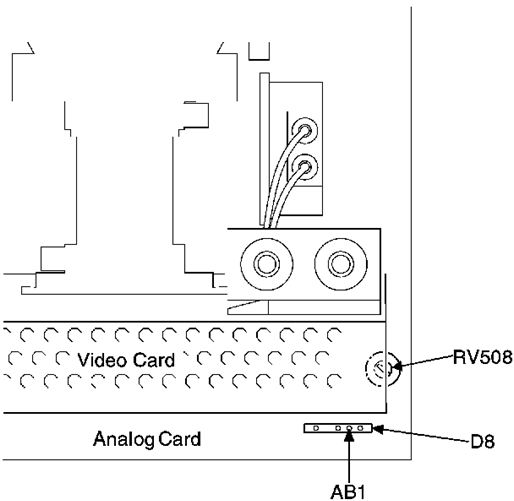 ![]() 4. Adjust RV031 (B.DRIVE) to give: (8517) -1.38 V dc. (9517) -1.60 V dc. 5. Press spacebar to get a full green screen. 6. Adjust RV021 (G.DRIVE) to give: (8517) -2.30 V dc. (9517) -2.15 V dc. 7. Press spacebar to get a full red screen. 8. Adjust RV011 (R.DRIVE) to give: (8517) -2.50 V dc. (9517) -2.60 V dc. 9. Press PF3 to return to setup patterns. Option 2, pattern B (50 mm square white block). 10. Press spacebar to get a white block. 11. Adjust RV102 (SUB.CONT) to the highest voltage possible within the range: (8517) -0.45 V dc to -0.50 V dc. (9517) -0.50 V dc to -0.55 V dc. 12. If voltage is not within this range, repeat all previous steps for this procedure. 13. Press PF3 to return to setup patterns. Select option 4, pattern D (Gray Scale). 14. Check at max and min contrast that the blocks are evenly gradated from black through to white with no color tinges. If they are not, repeat this procedure. 15.