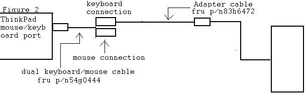 Plug the Adapter Cable, FRU P/N83H6472, into the keyboard cable connector with the mouse symbol. Plug the other end of the Adapter Cable into the Docking station or Port Replicator mouse port connector (Figure 1). If a ThinkPad is being used as stand-alone, plug the other end of the Adapter Cable into the keyboard / mouse connector cable's mouse port in (Figure 2).
