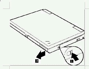 1. Press the battery cover release latch (1) and slide out (2) the battery cover.