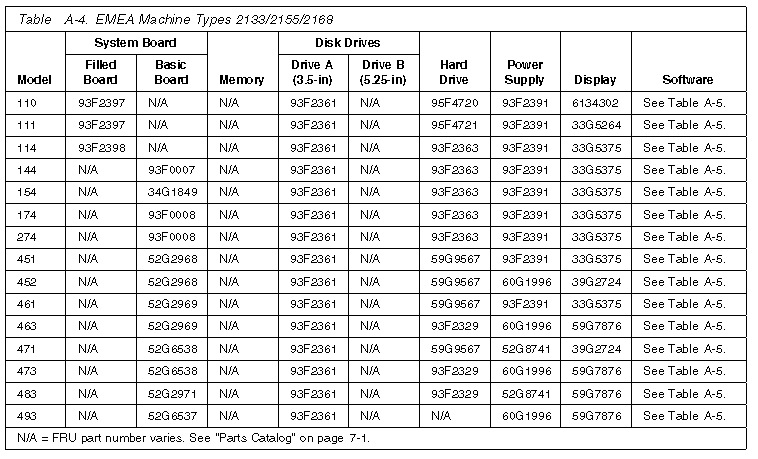PS/1 - FRU Part Numbers for EMEA M/T 2133/2155/2168