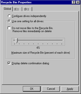 The Recycle Bin may take up to 10% of your hard drive's capacity. Ten percent is the default setting. What this means is, if you 'delete' a file, the file is moved into the Recycle Bin. This bin will continue to fill until the user-definable maximum is reached. If you take no action, this could take 100MB of space on a 1GB drive.
