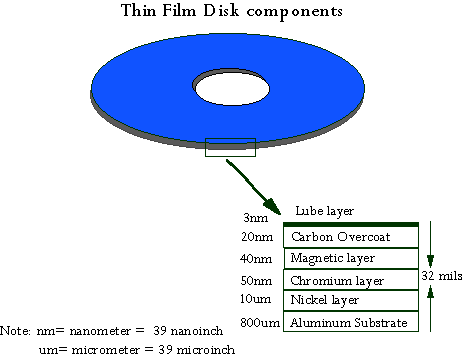 A disk is defined as a thin film medium. That is multiple thin film layers of various materials are deposited onto the disk through a sputtering process. The general structure of a disk is shown below. The substrate on which the magnetic and other materials are deposited is always aluminum for 3.5" HDD's (glass substrates are used for 2.5" drives to improve shock characteristics).