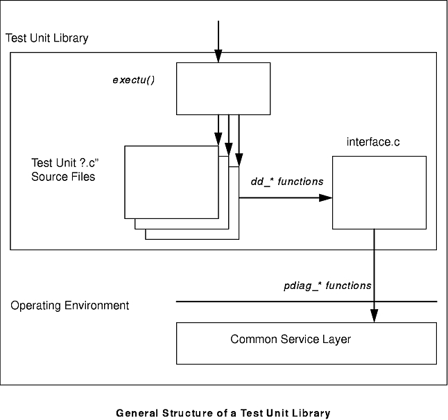 The figure also illustrates how TU libraries should include a C source file that implements the exectu() interface, which provides the program entry point for the TU library, decodes the specified TU number to the correct internal function, and calls that function.