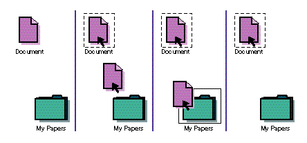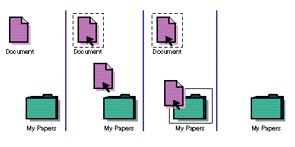 A user moves elements to change their location. For example, the user can move a file to a new directory, move a graphic to a different position in a piece of artwork, or move text to a different section in a letter.