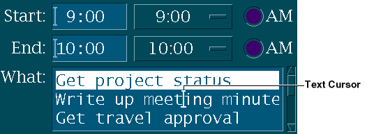 For more information, see the Cursor, Input Focus, Keyboard (Device), Selection, and Text-Entry Field (Control) reference pages.