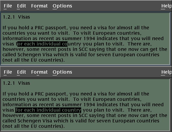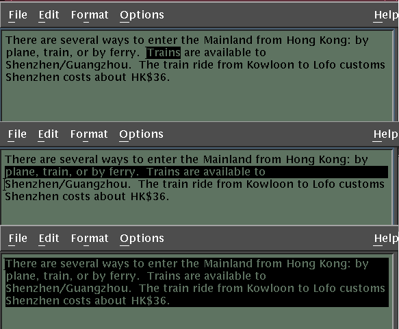 The multilevel technique is available for selecting groups of elements that have some sort of hierarchical structure. The user can click either multiple times on text or adjacent to an element. With the first click, that text or element is selected. With each subsequent click, higher-level groups of adjacent elements are selected (see Figure 32). For example, a SELECT double-click (two clicks) would select a word, and subsequent clicks would select lines, paragraphs, sections, and so on. The user can combine this technique with the range techniques to select a hierarchical range of text or elements quickly. For example, in text SELECT double-press (two presses) and move would select a range of text one word at a time.