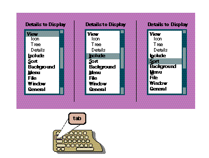 With the browse technique, the user presses the SELECT button within the scope, moves the pointer (browses) until it is on the desired element, then releases the button. As the pointer moves over the elements that can be selected, selection emphasis is moved from one element to the next until the final selection is made at the release of the SELECT button (see Figure 27).