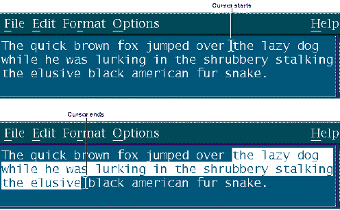 With the range click technique, the user clicks the SELECT button at the beginning of the range of elements to be selected and Shift SELECT at the end of the range. The elements within this range are then shown with selected emphasis (see Figure 29). The range click technique is useful in text for defining the beginning and ending point of a selection. People with repetitive stress injuries who find it painful to move the mouse while pressing a button will find the range click technique helpful. It is also useful when selecting a large range of elements that does not fit on one screen. The user can click on the beginning point, then scroll to the end of the range and click on the ending point.
